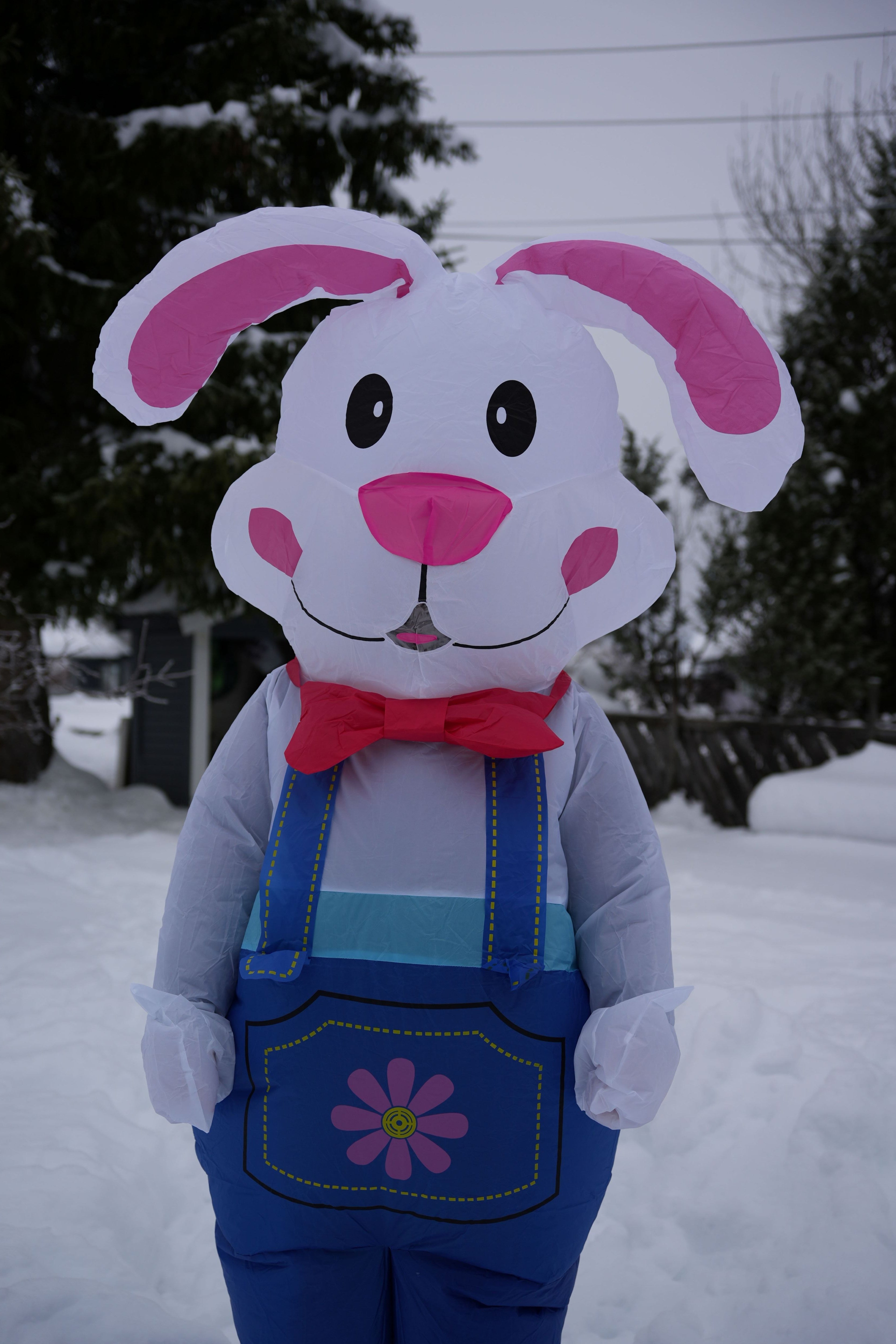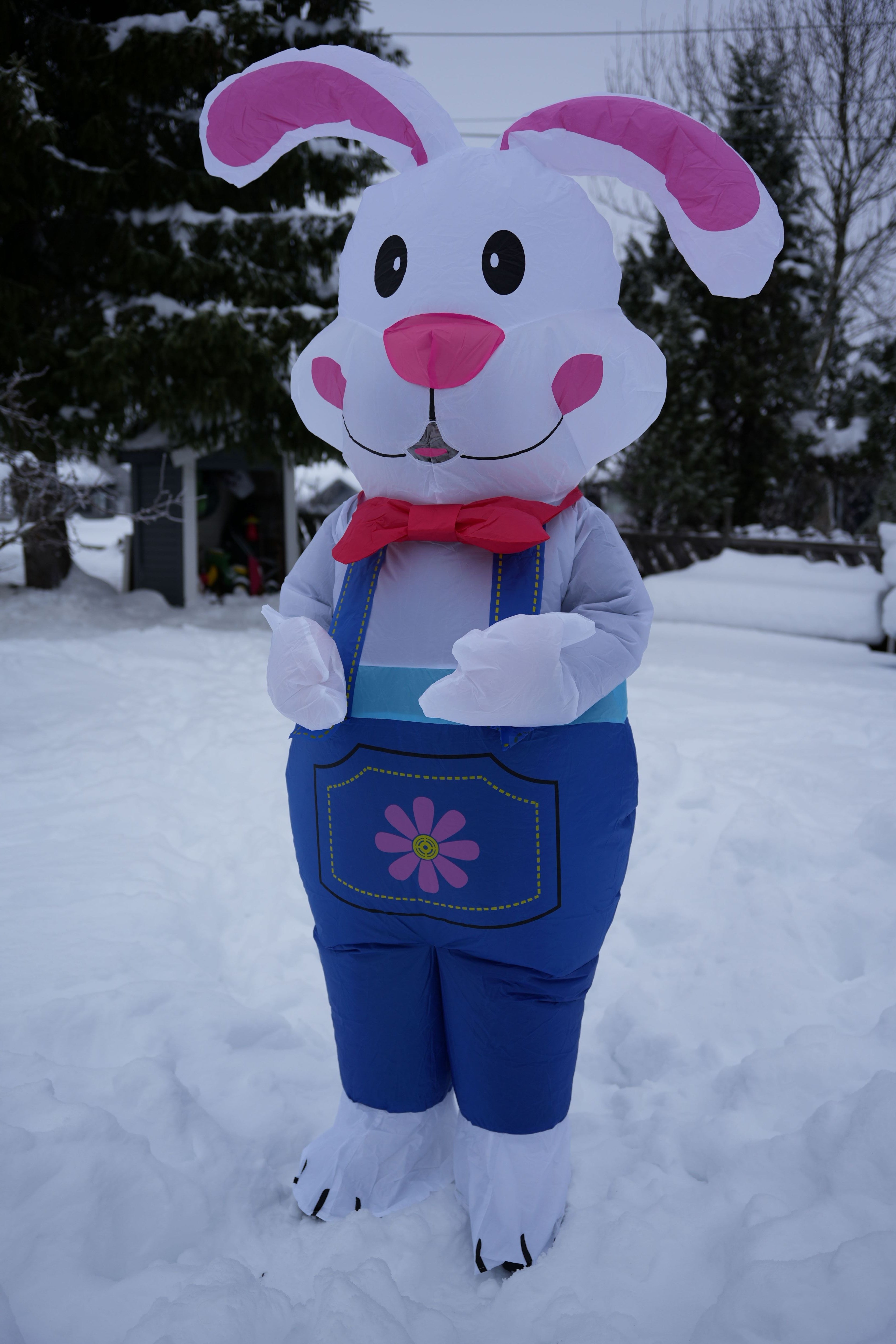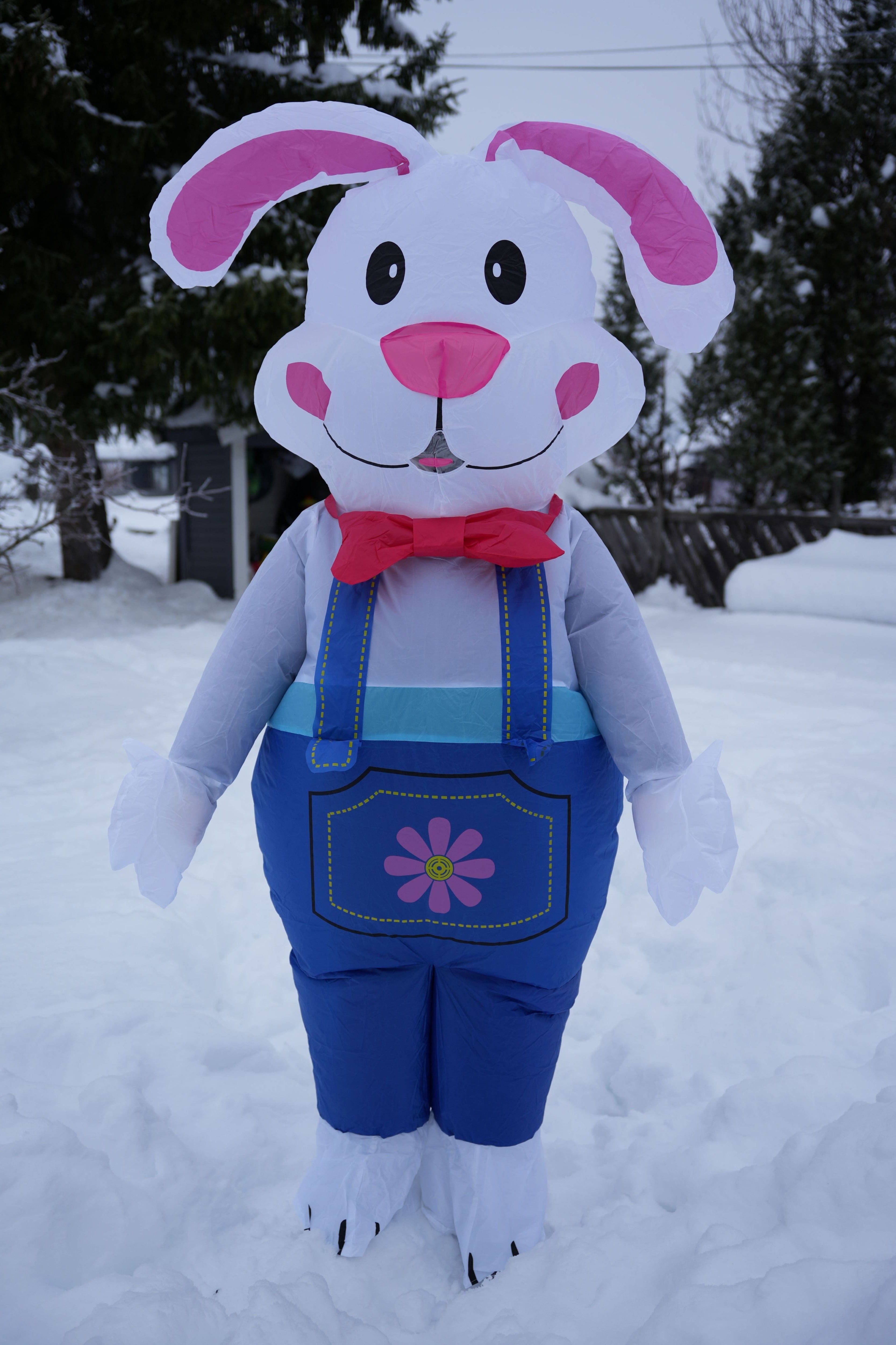 Kostymet leveres med en liten innebygd vifte som holder det konstant oppblåst under bruk. Det er laget av lett og slitesterkt materiale som gir god bevegelighet og komfort, slik at du kan hoppe rundt, overraske store og små, legge påskeegg og bli den mest populære påskeharen i hele nabolaget.